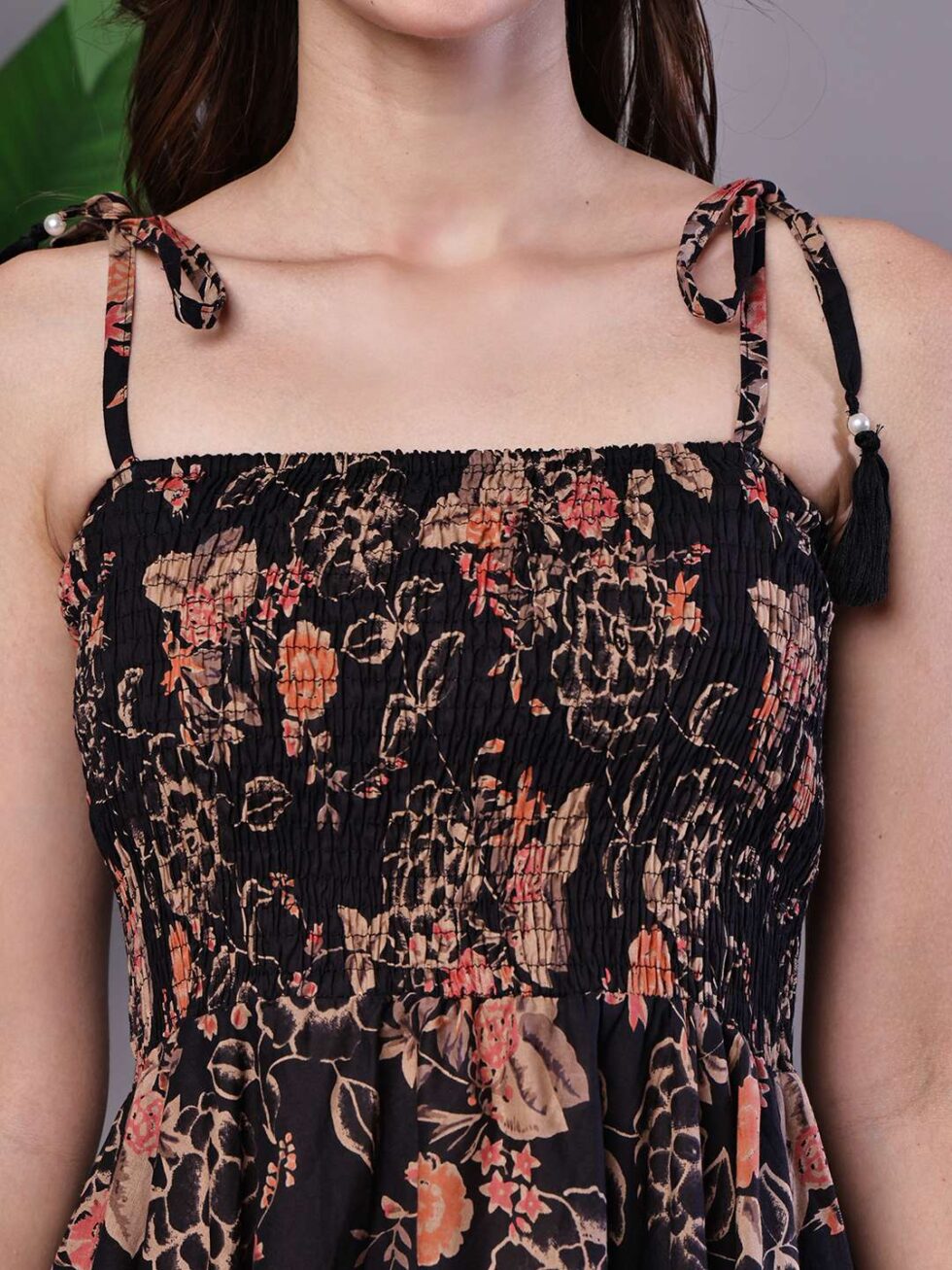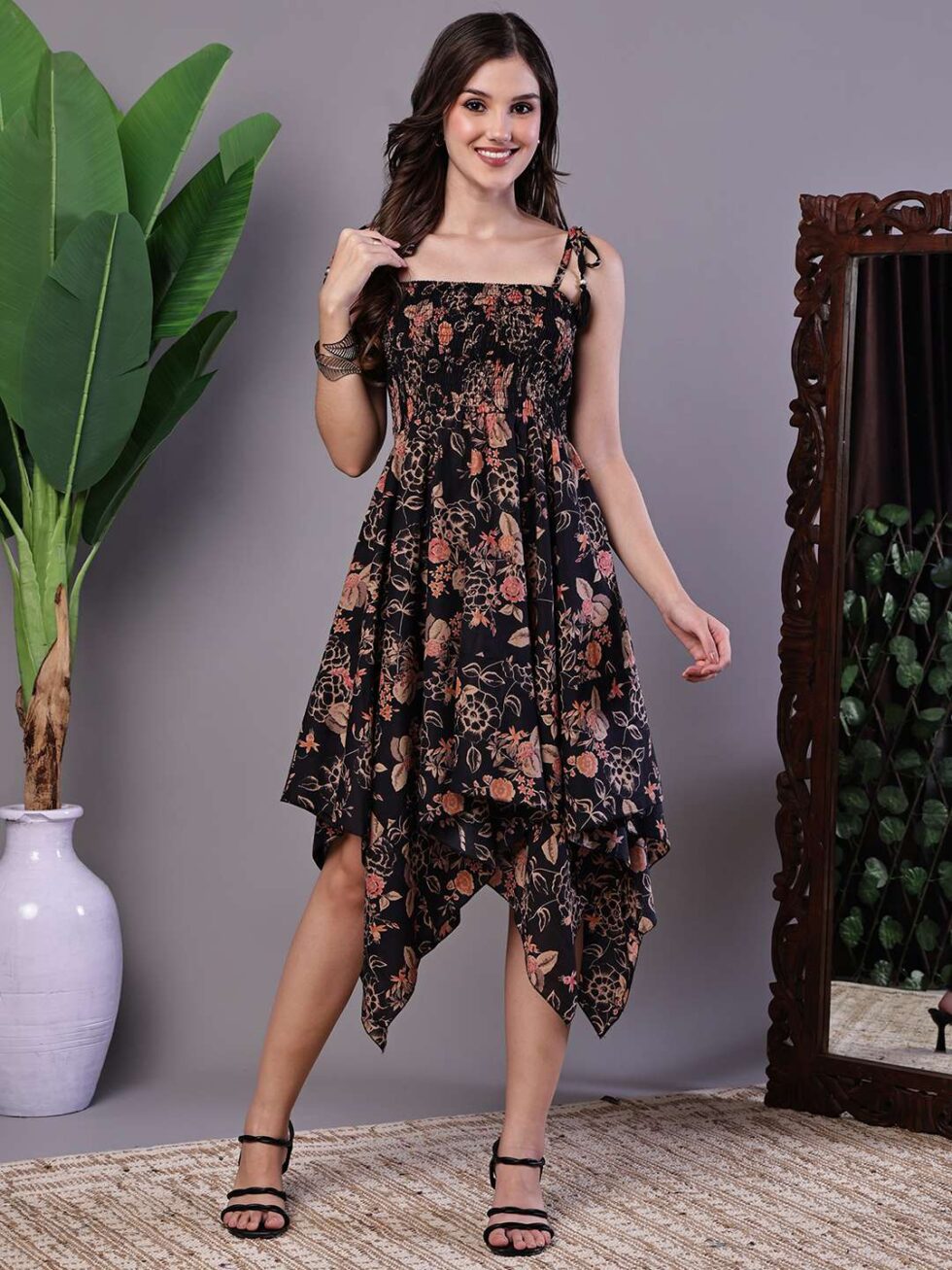 Women’s Black Floral Printed Cotton Handkerchief Hem Dress Midi Dresses